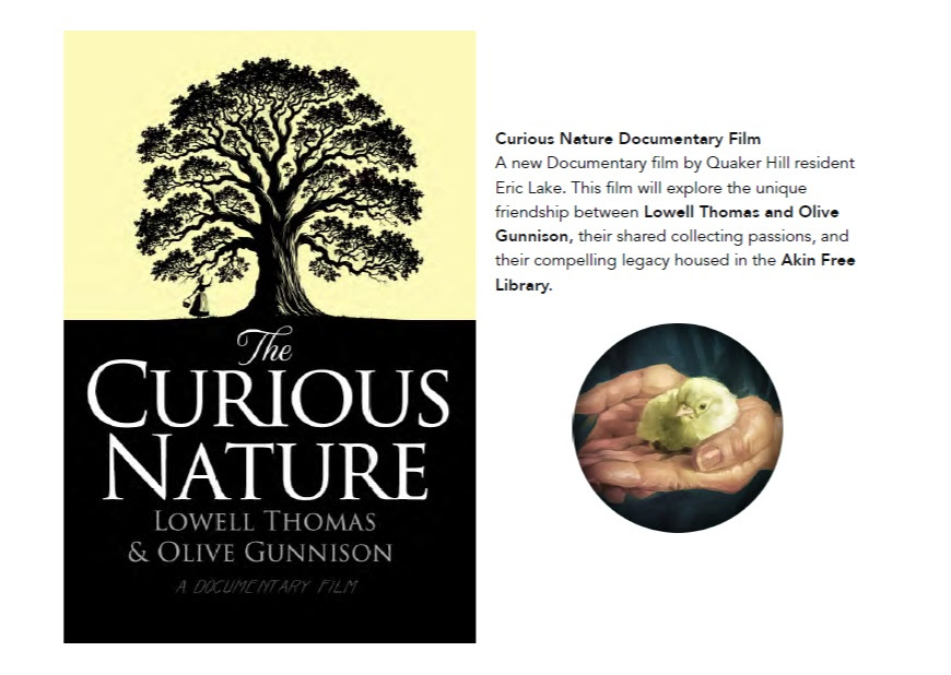 After the annual business meeting, local resident Eric Lake, a documentary filmmaker and artist, will talk about Lowell Thomas’ roots and influence on Quaker Hill and will premier his new film trailer on Lowell’s association with the Akin Free Library, and involvement in bringing Olive Gunnison’s vast natural history collection to the Library in 1960.